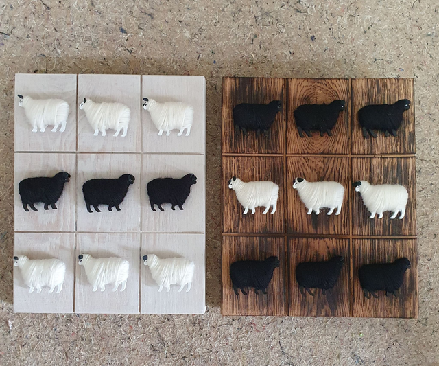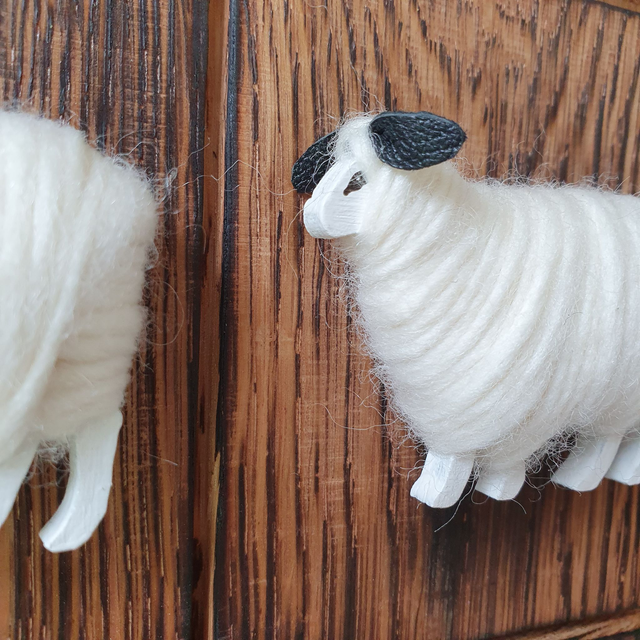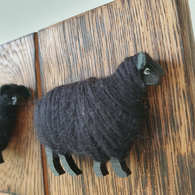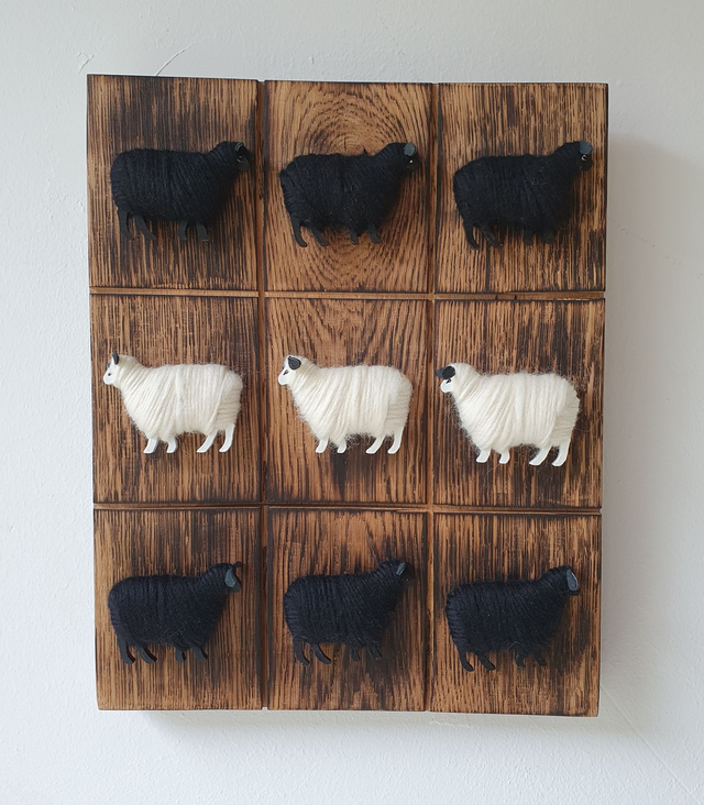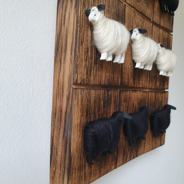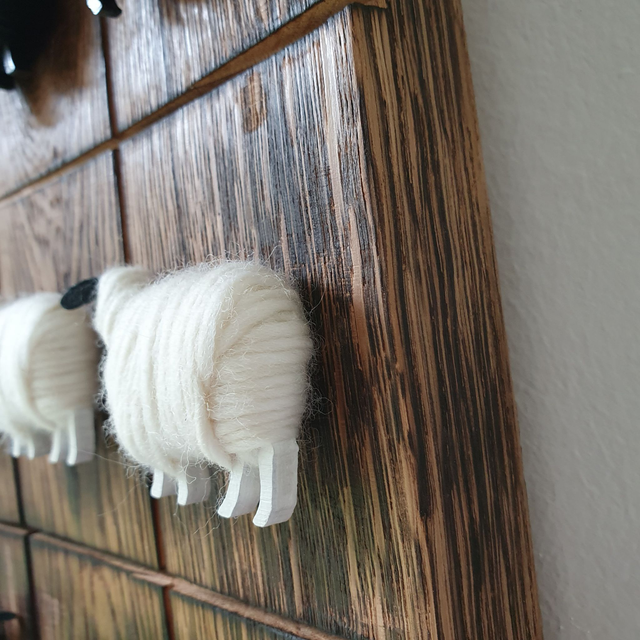9 moutons réalisés en bois, coiffés de leur véritable laine, oreille en cuir. Support en chêne.
